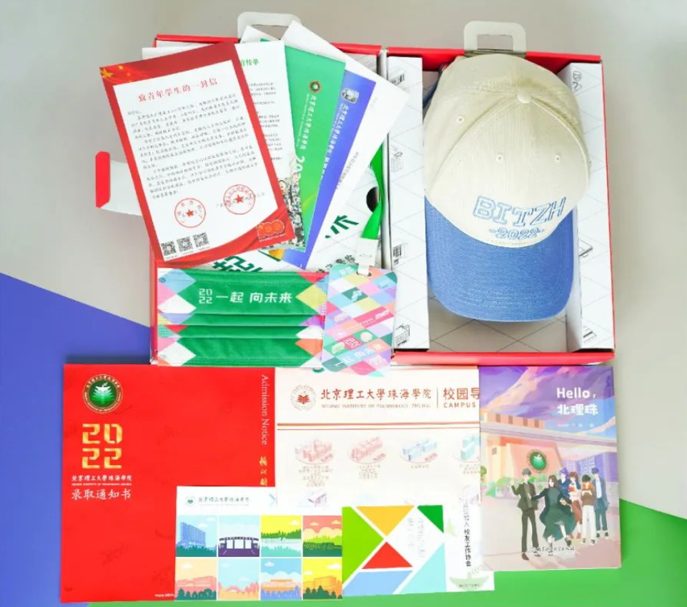作为送给新生的第一份见面礼,录取通知书,做了全新升级。两盒一体互扣成“行李箱”的形状,正如你的梦想与北理珠环环相扣,轻轻打开,录取通知书 映入眼帘,并有四重好礼赠予你。
