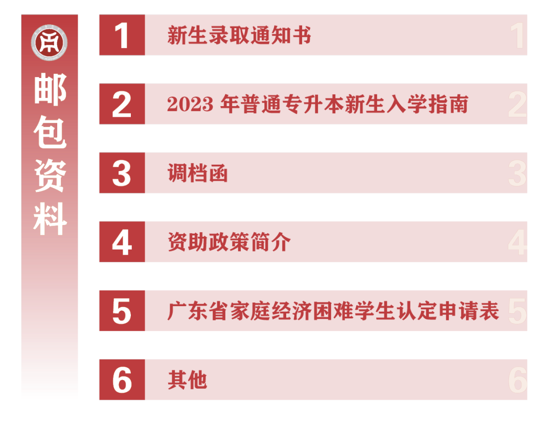 通知书信封内装有十分重要的资料。除了新生录取通知书之外,邮包内还有:广州华商学院2023年普通专升本新生入学指南、资助政策简介、广东省家庭经济困难学生认定申请表、调档函等资料,请同学们收到录取通知书后,认真仔细查阅。