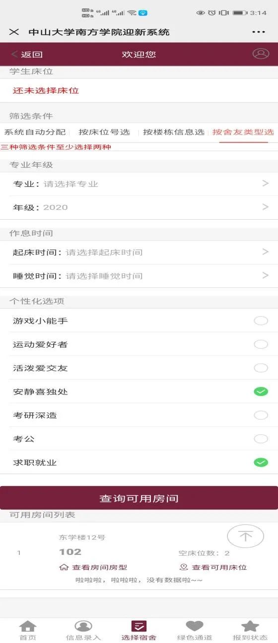 A:同学们可以选择系统自动分配、按照床位号选择、按照楼栋信息选择、按照舍友类型选择,因为有划分学院宿舍区,舍友多为同专业或者同学院的同学。如果担心遇到的舍友不合自己的生活习惯和作息的同学,可以提前约好同学院的小伙伴一起选择同一个宿舍哟!