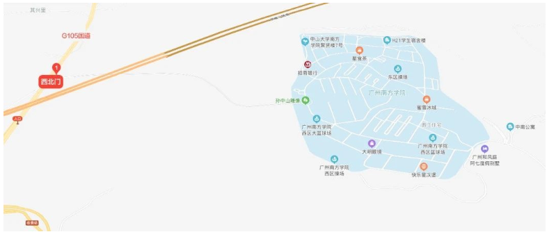 私家车(或出租车、网约车等),导航输入“广州南方学院西北门”,按导航行驶,经大广高速(温泉出口)到达学校北门牌坊。
